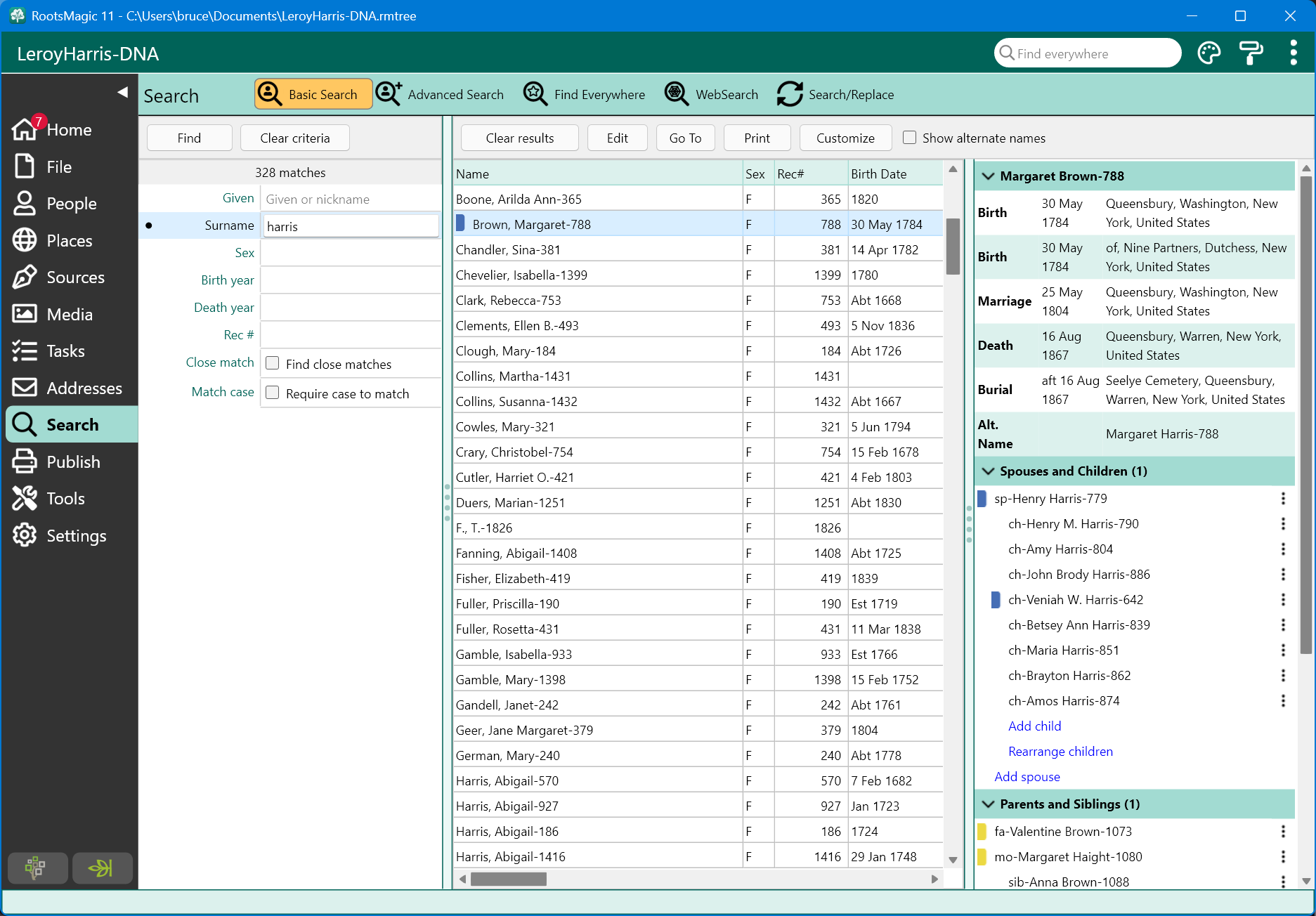 Basic Search in RootsMagic 11 still works the way you expect: type in a name (or part of a name), and see a list of matches. But what happens after the search is where the real improvements shine.