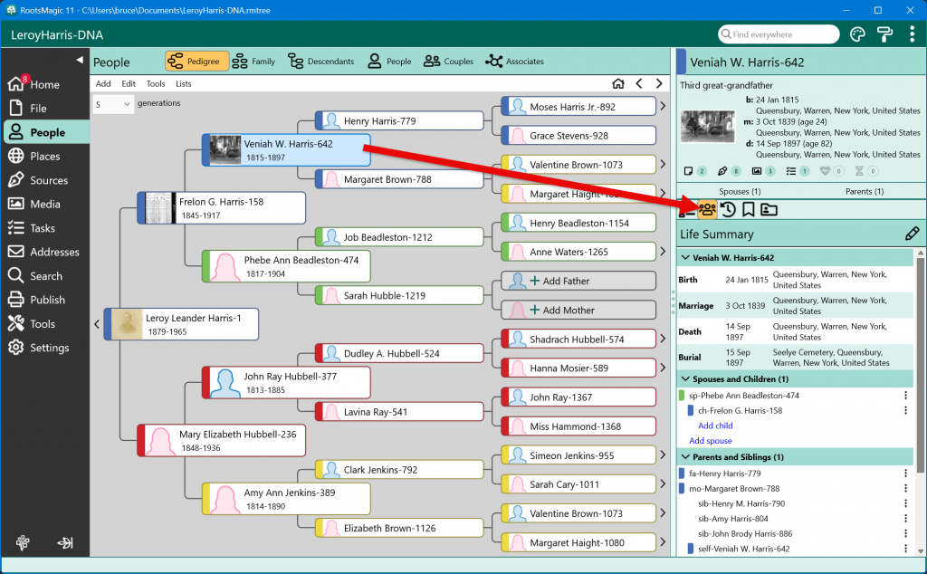 Each section of the Life Summary can be expanded or collapsed, and RootsMagic remembers your preferences. If you like keeping family relationships visible while hiding detailed events, you can do that — and it will stay that way as you move from person to person, even after closing and reopening the program.